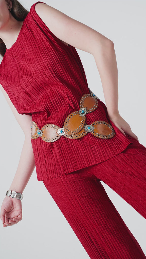 The Alta Buena Leather Belt is a striking piece designed for the bold, modern wanderer. Crafted from premium calfskin, it features rivets, a buckle, and an oval-shaped leather piece, adding a distinctive touch. Medallions in rich caramel leather are accented with metal studs, while conchos with turquoise stones link them together, capturing a tribal-inspired spirit. With its high-quality hardware and Western flair, this belt is a unique statement accessory, perfect for adding an authentic, stylish edge to any outfit.